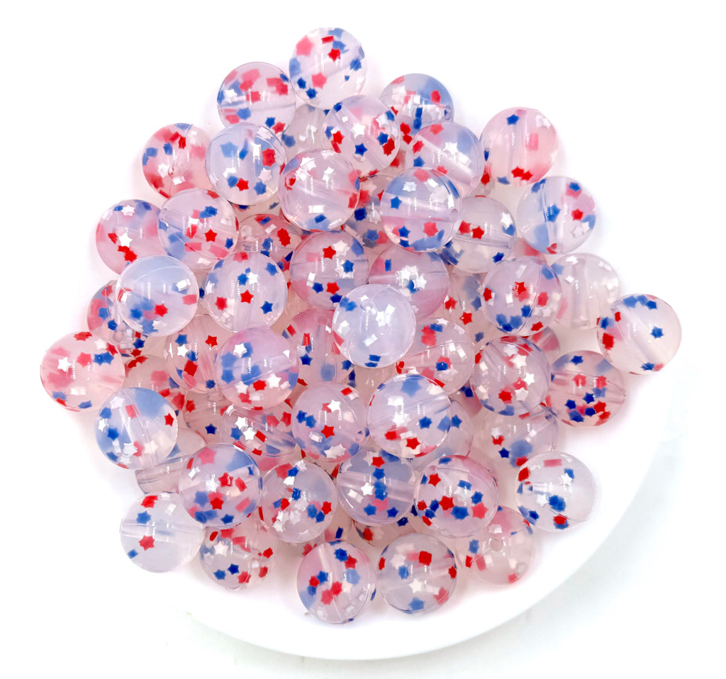 Star Confetti silicone beads! 15mm clear round beads with red, white and blue star confetti! Beads have a hole size of 2.5mm. These are made with 100% food grade silicone!