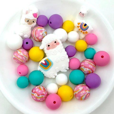 You will receive a mix of 12mm and 15mm round beads plus 3 shaped beads. Beads have a hole size of 2.5mm. These are made with 100% food grade silicone!